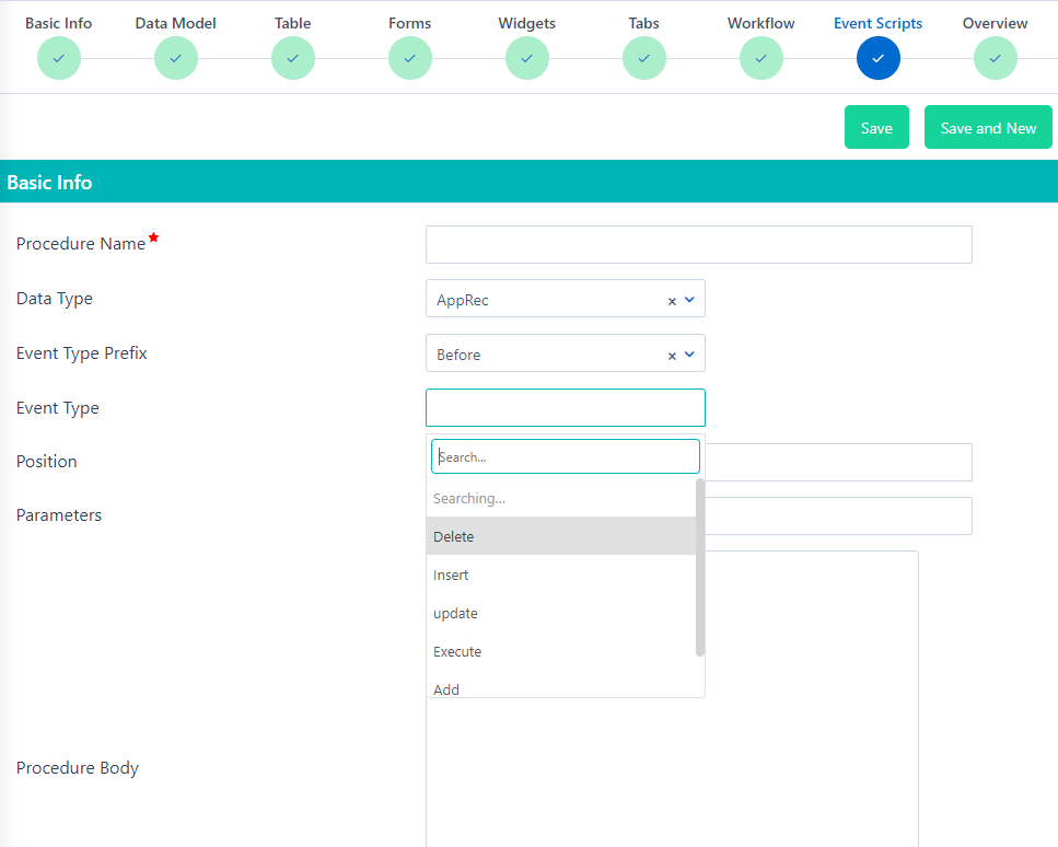In this step, you are able to write scripts for a certain Data Type to be executed before/after/on a specific event.