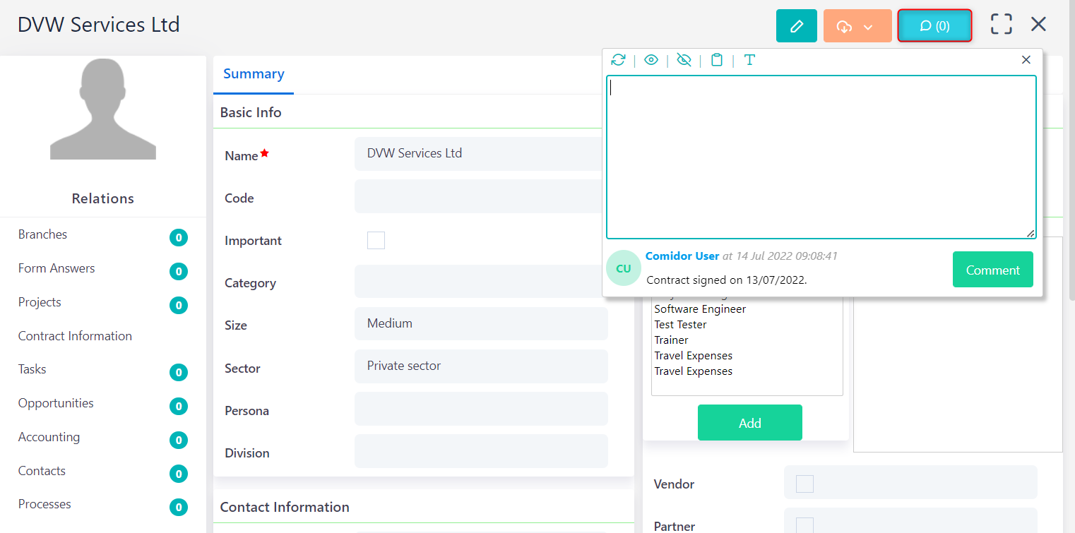 - Click on Links to add a new Link between this Account and any other Comidor object e.g. a Project, an Event, etc