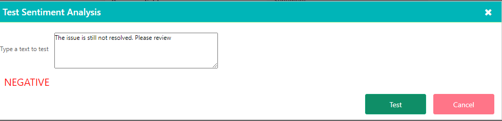 - In the pop-up window, type your test data, click on the Test button and you will see the sentiment result (POSITIVE, NEUTRAL, NEGATIVE).